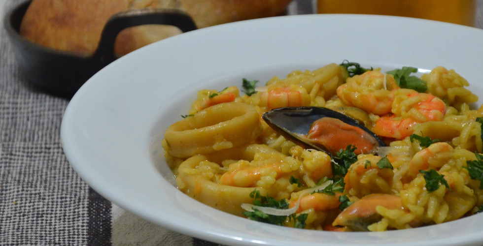 1. Preparar la mise en place: cubos de calabaza, arroz carnaroli, lima, camarones, mejillones, ajo, rabas, zucchinis, cebolla, queso y caldo.